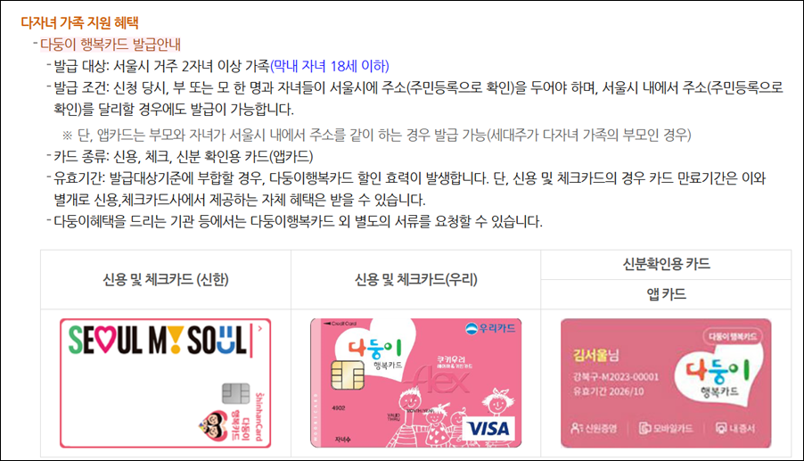Q5. 소득이 높으면 신청이 불가능한가요? A5. 일반적인 다둥이 행복카드 발급은 소득 제한이 없으므로 다자녀 가구라면 누구나 혜택을 누릴 수 있습니다.