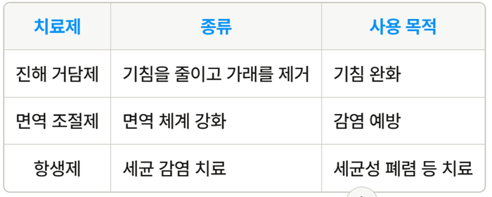 가래를 치료하기 위한 약물도 여러 종류가 있습니다. 각각의 약물은 특정한 증상이나 원인에 따라 다르게 작용합니다. 다음은 가래 치료제의 종류를 정리한 도표입니다.