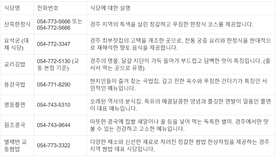 | 3 | 관광지와 맛집 동선 연계 시 꿀팁은 무엇인가요? | 불국사, 석굴암 관광 후 인근 맛집으로 동선을 바로 연계하면 시간을 효율적으로 절약할 수 있습니다. |