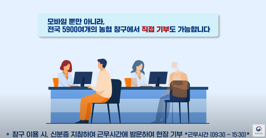 온라인 사용이 익숙하지 않거나 직접 방문하여 상담을 받고 싶다면 가까운 농협은행 또는 지역 농·축협을 방문하여 기부할 수 있습니다. 신분증을 지참하고 방문하여 기부신청서를 작성하면 직원의 안내에 따라 기부를 진행할 수 있습니다. 답례품은 현장에서 선택하거나 추후 발송받는 방식으로 진행됩니다. 온라인 접근이 어려운 분들에게 유용한 방법입니다.