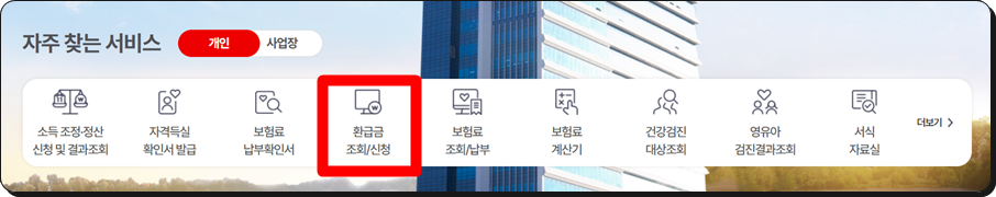 로그인 완료 후 메인화면 중간의 ‘방문자별 맞춤 메뉴’에서 ‘환급금 조회/신청’을 클릭합니다.