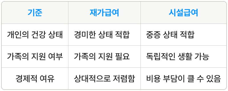 재가와 시설급여 중 어떤 것을 선택해야 할지 고민되는 분들을 위해, 선택의 기준을 제시합니다.