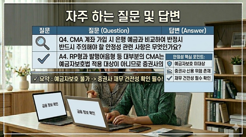 Q4. CMA 계좌 가입 시 은행 예금과 비교하여 반드시 주의해야 할 안정성 관련 사항은 무엇인가요? A4. RP형과 발행어음형 등 대부분의 CMA는 예금자보호법 적용 대상이 아니므로 증권사의 재무 건전성을 확인해야 합니다.