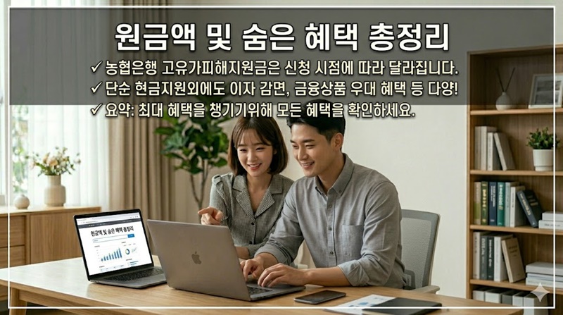 정확한 지원 금액은 농협은행 공식 공지 또는 고객센터(1588-2100)를 통해 반드시 확인하시고, 중복 수령 가능 여부도 함께 문의하시면 최대 혜택을 받을 수 있습니다.