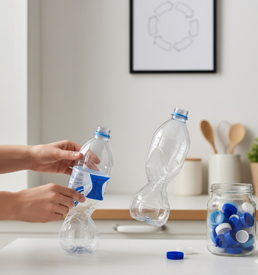 3단계: 압축 및 뚜껑 닫기 깨끗하게 비우고 헹군 투명 페트병은 최대한 찌그러뜨려 압축합니다. 압축 후에는 병마개를 닫아 부피를 줄인 상태로 배출합니다. 병마개는 페트병과 같은 재질인 경우가 많아 그대로 닫아 배출해도 됩니다.