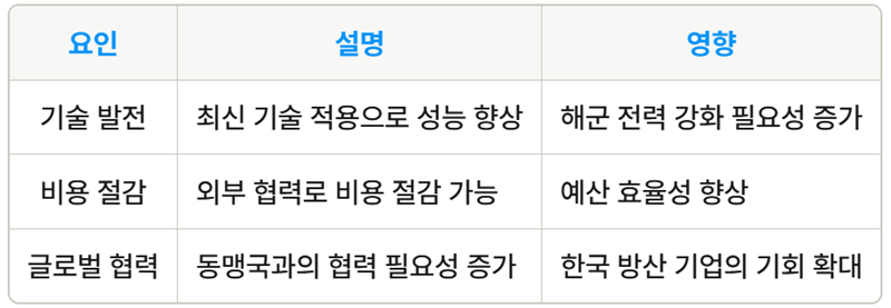 미국 해군의 이러한 변화는 한국 방산 기업들에게 새로운 기회를 제공할 수 있습니다. 특히, 한국은 이미 현대적인 군함 건조 기술을 보유하고 있으며, 미국과의 협력 가능성이 높습니다.