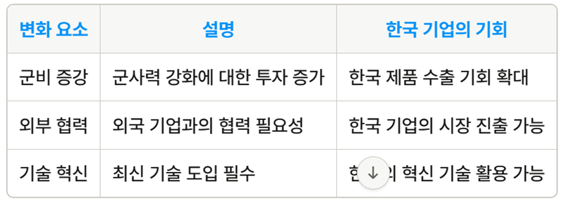 이러한 변화는 한국 방산 기업들이 미국 방산 시장에 진출할 수 있는 좋은 기회를 제공합니다. 특히, 한국의 첨단 기술이 미국의 요구에 부합할 수 있는 경우가 많아 협력 가능성이 높습니다.