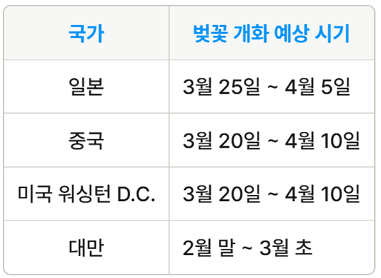 벚꽃은 한국뿐만 아니라 세계 여러 나라에서도 사랑받고 있습니다. 각국의 벚꽃 개화 시기를 살펴보면 다음과 같습니다.