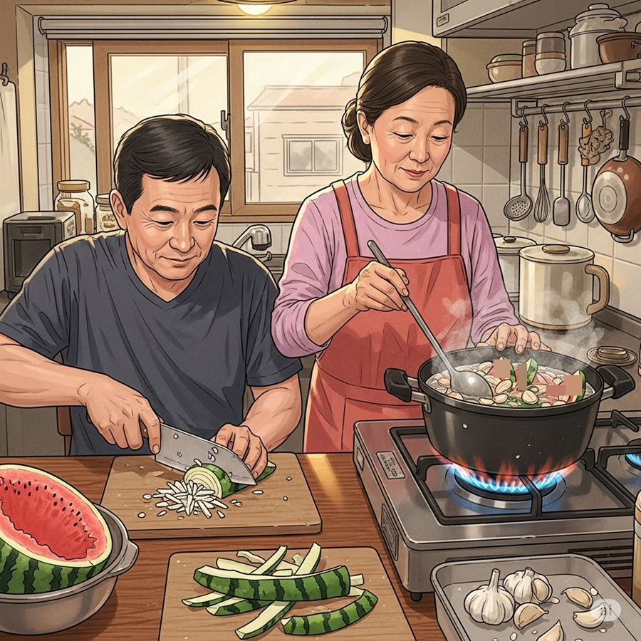 신장 건강을 위한 수박 마늘탕은 의외로 간단합니다. 핵심은 버려지기 쉬운 수박 껍질과 마늘을 함께 활용하는 것입니다. 먼저, 수박 껍질과 마늘을 잘게 썰어 물과 함께 약 20분간 끓입니다. 이 과정에서 수박 껍질에 풍부한 시트룰린과 마늘의 알리신 성분이 국물에 충분히 우러나옵니다.