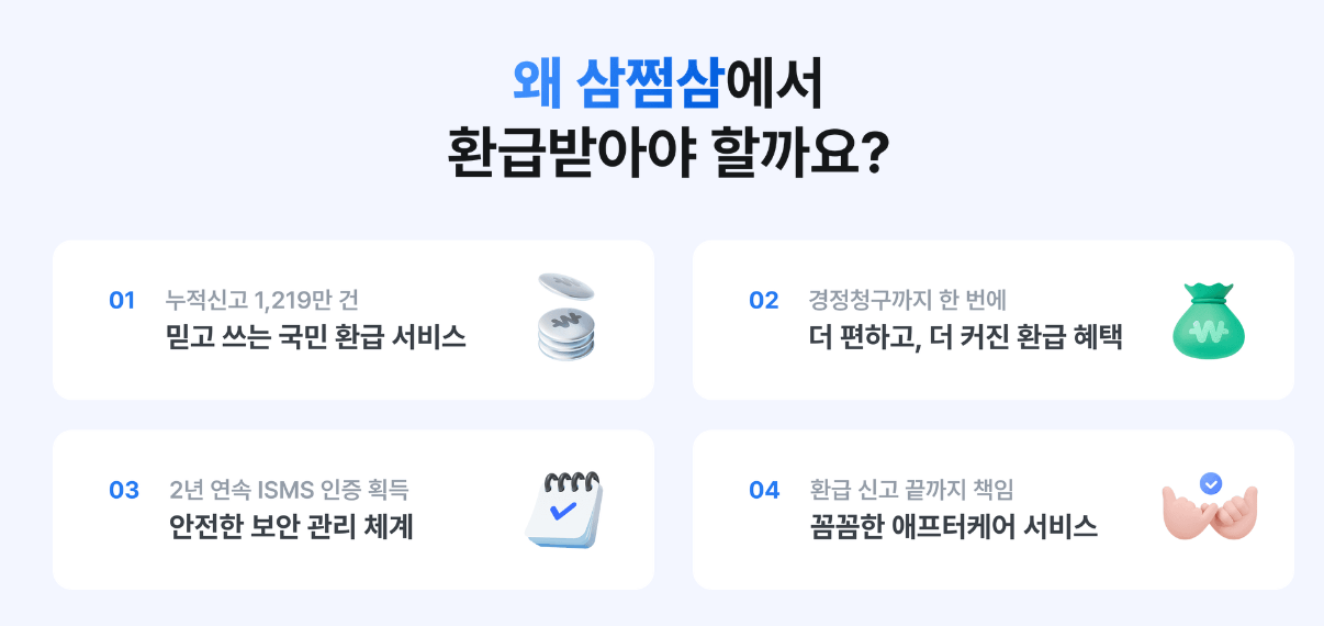 이미 많은 사람들이 이용하며 '국민 환급 서비스'라고 불릴 만큼 신뢰를 쌓은 곳들은 다릅니다. 그들은 복잡한 세무 지식 없이도 누구나 쉽게 환급금을 찾을 수 있도록 더욱 편한 인터페이스를 제공하고, 잠들어 있는 더 큰 환급액을 꼼꼼하게 찾아주는 노하우를 가지고 있습니다.