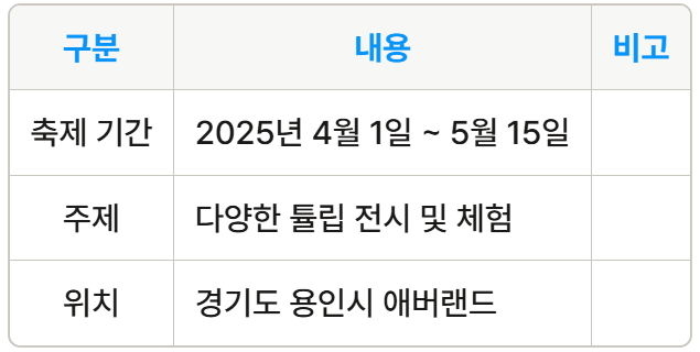 2025년 에버랜드 튤립축제는 화려한 튤립과 함께하는 아름다운 경험을 제공합니다. 스마트한 예매 방법과 다양한 할인 혜택을 통해 더욱 알찬 방문이 가능하니, 미리 준비해보세요.