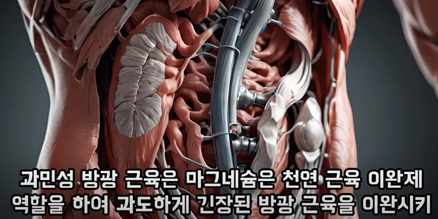 | 3. 과민성 방광 근육 | 마그네슘 | 마그네슘은 천연 근육 이완제 역할을 하여 과도하게 긴장된 과민성 방광 근육을 이완시키고, 방광이 소변을 더 여유 있게 저장하도록 돕습니다. |