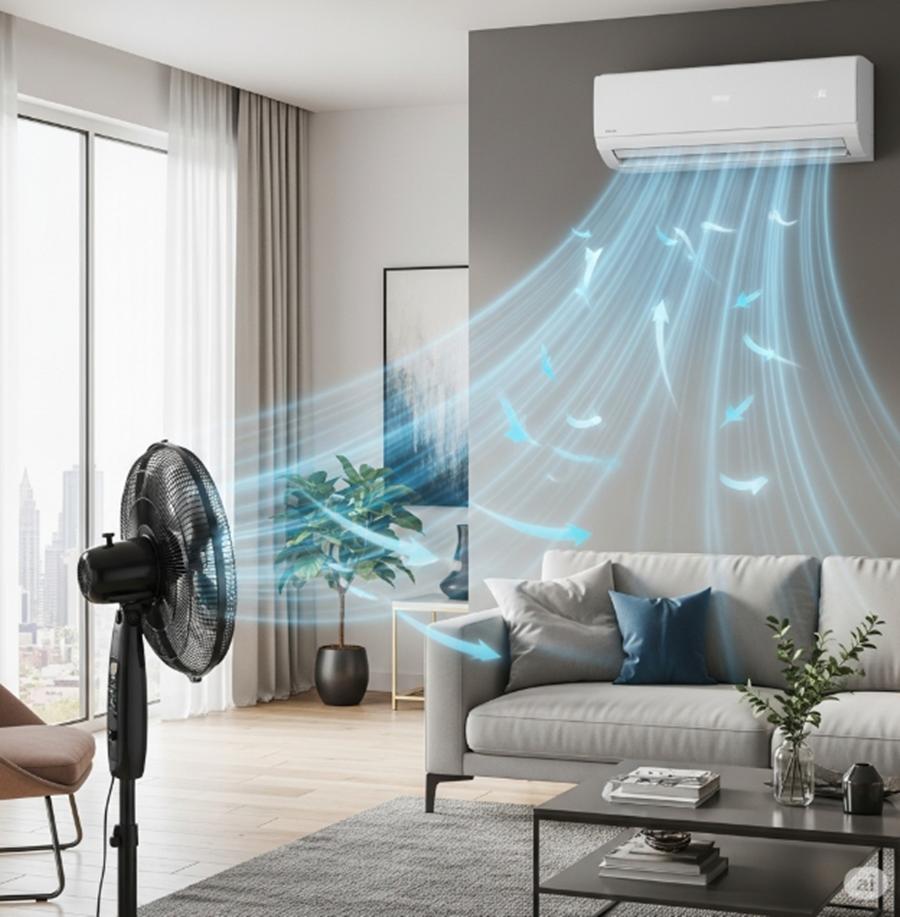 에어컨 바람이 선풍기를 통해 순환되도록 배치하여 냉방 효율을 극대화하세요. 이렇게 하면 실내외 온도 차가 줄어들어 혈액순환과 관절 건강에도 좋고, 깊은 잠을 잘 수도 있습니다.