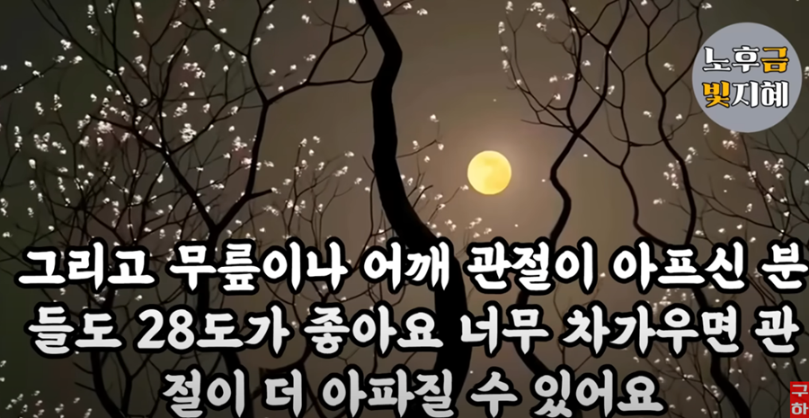 특히 고혈압이나 당뇨병 등 만성질환이 있는 분들에게도 이 방법은 건강상 이점을 제공합니다. 밤에 잠들 때는 28~29도가 적당하며, 새벽에 몸 경직과 통증이 오는 것을 방지할 수 있습니다.