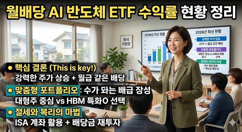 요약: 주요 AI 반도체 ETF는 2026년 들어 20% 내외의 수익률과 연 6% 수준의 월배당을 동시에 달성하고 있습니다.