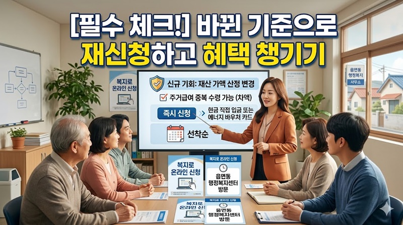 올해부터는 재산 가액 산정 방식이 본인에게 유리하게 변경되어 작년에 아쉽게 탈락했던 분들에게도 기회가 돌아가게 되었습니다. 특히 주거급여를 이미 받고 계신 분들은 중복 지원이 안 된다고 생각하시는데, 지원 항목이 다르면 차액 수령이 가능합니다.