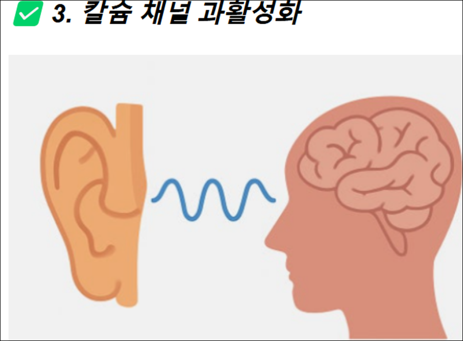 - 칼슘 채널 과활성화: 신경세포 내 칼슘 이온이 지나치게 많아지면 신경이 과흥분 상태에 머물러 작은 자극도 '소리'로 잘못 인식하게 됩니다.