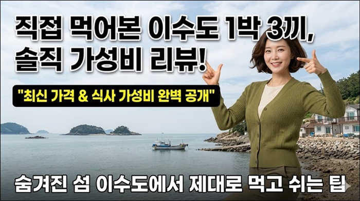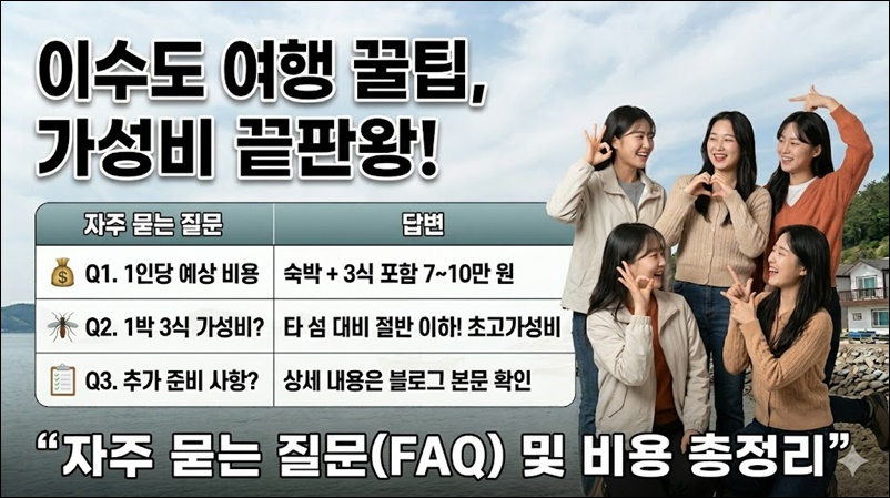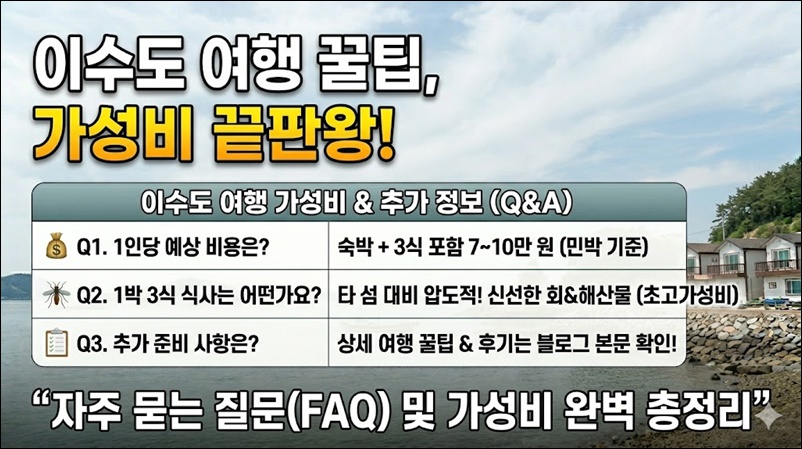 요약: 이수도 1박3식 총비용은 1인 약 7~10만 원, 제주 대비 절반 이하의 가성비 여행지