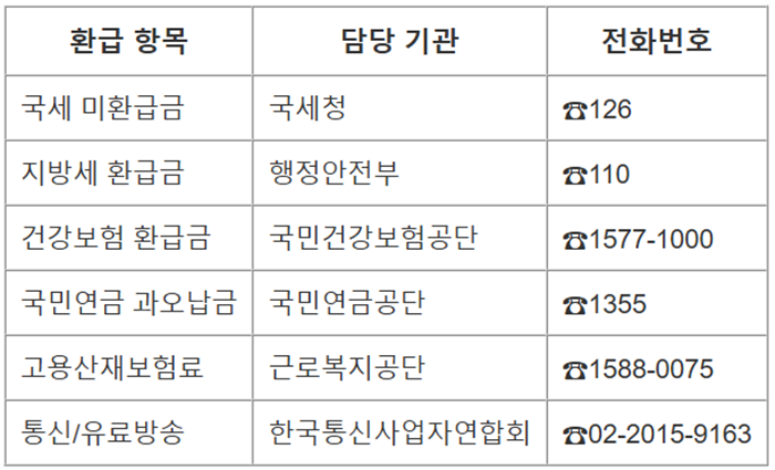 | 환급 항목 | 담당 기관 | 전화번호 |
