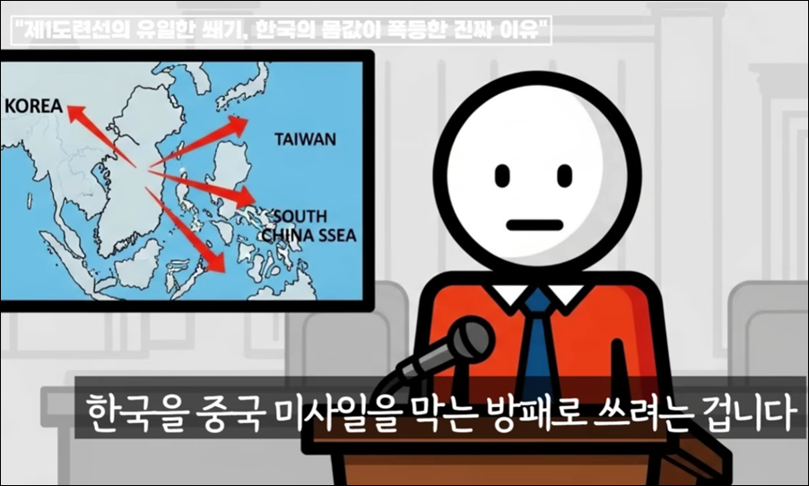 요약: 한국은 중국 심장부를 10분 내 타격할 수 있는 유일한 육상 전초기지로 중국에 치명적 위협입니다.