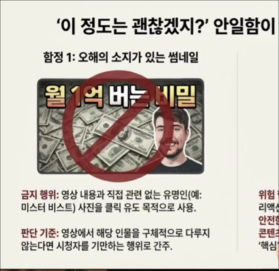 Q3: 유명인의 얼굴을 썸네일에 사용하는 것이 왜 위험한가요? A3: 초상권 침해뿐만 아니라 시청자를 기만하는 낚시성 콘텐츠로 분류되어 채널 정지의 결정적 사유가 됩니다.