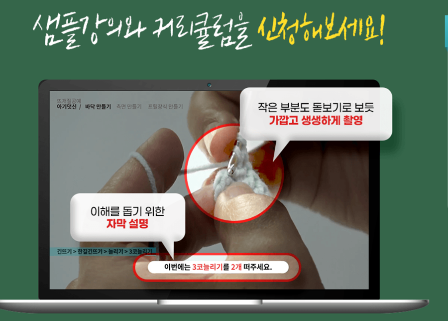 지금 바로 수강 등록하세요! 당신의 뜨개질 여정을 응원하기 위해, 저희가 특별한 선물을 준비했습니다. 고급 코바늘 세트와 다채로운 색상의 실 세트를 무료로 보내드립니다. 별도의 준비물 없이 바로 뜨개질을 시작할 수 있는 절호의 기회, 놓치지 마세요!