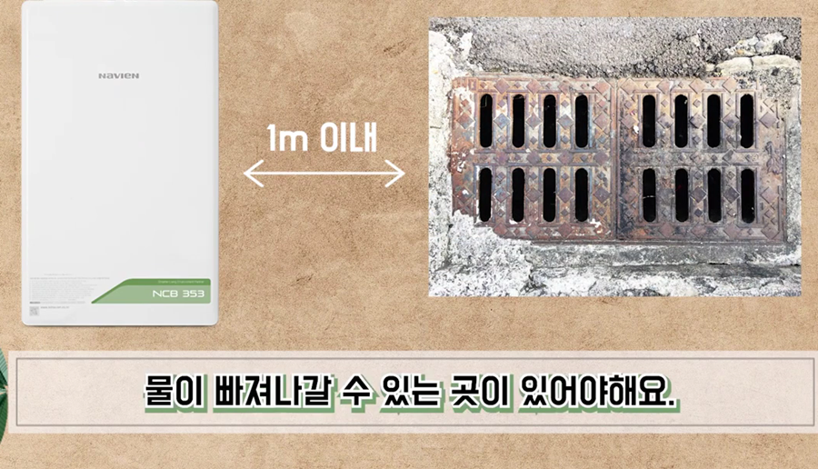 1m 이내에 응축수를 외부로 배출할 수 있는 배수 시설(배수구)**이 있어야 합니다. 배수구 설치가 불가능하다면 보조금 지원 대상이라도 설치 자체가 어렵습니다.