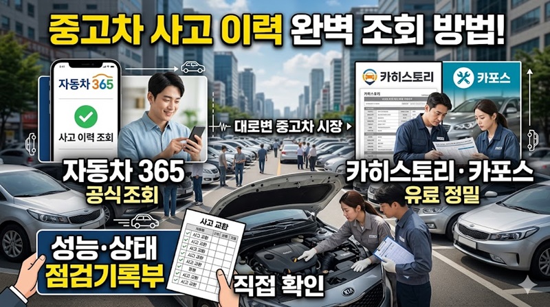 보험개발원이 운영하는 카히스토리(www.carhistory.or.kr)와 손해보험협회의 카포스(www.kidicar.com)에서는 보험 처리된 사고 내역, 전손·침수 이력, 도난 여부를 확인할 수 있습니다. 1회 조회 비용은 약 1,000~3,000원이며, 중고차 구매 전 필수 절차입니다.