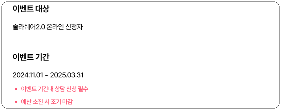 솔라쉐어2.0 온라인 신청자에게 이벤트 기간 2024.11.01 ~ 2025.03.31까지입니다.