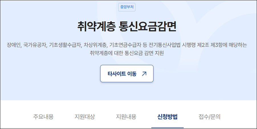 복지로 홈페이지에 접속한 뒤 공인인증서 또는 간편 인증으로 로그인합니다. 메인화면에서 '통신비 지원' 메뉴를 클릭하고 신청하기 버튼을 누르면 신청 화면으로 이동합니다.