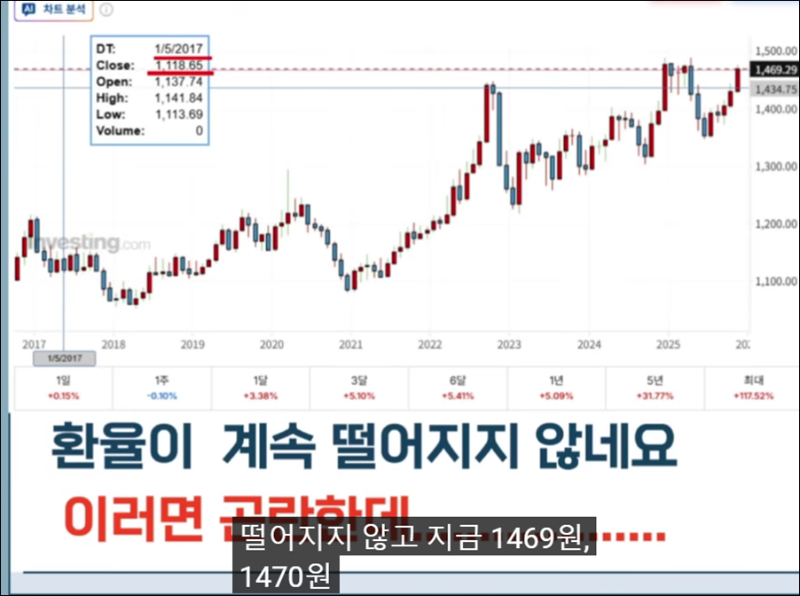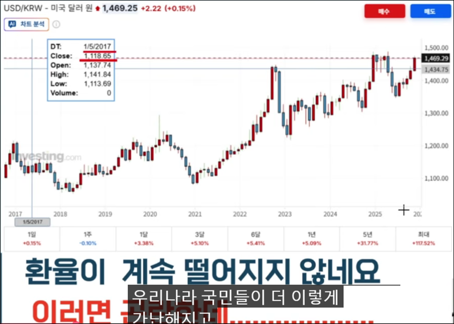 현재의 원/달러 환율 상승은 과거처럼 외부 충격에 의한 일회성 폭등이 아니라, 장기간에 걸쳐 한국 경제의 기초 체력 약화와 글로벌 통화 질서 변화가 복합적으로 작용한 결과입니다. 특히 지난 5년 전과 비교할 때 원화 가치가 실질적으로 30% 이상 하락했다는 점은, 우리가 아무것도 하지 않아도 보유 자산의 실질적인 구매력이 그만큼 감소했다는 뜻입니다.