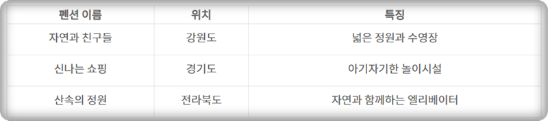 이제 실제로 인기 있는 키즈펜션을 소개하겠습니다. 다양한 시설과 프로그램이 마련된 키즈펜션은 가족 여행에 적합한 최적의 선택이 될 것입니다.